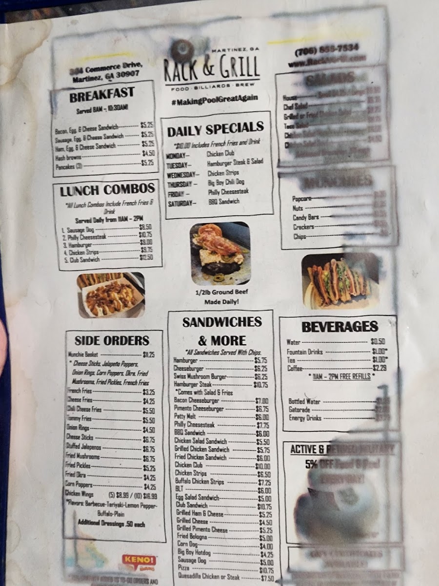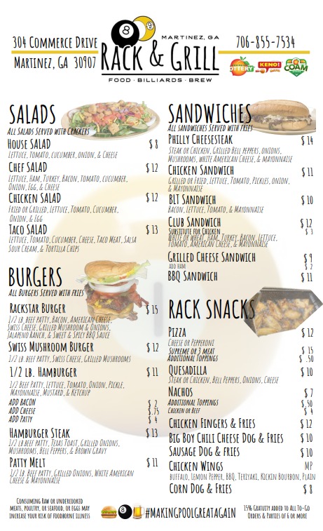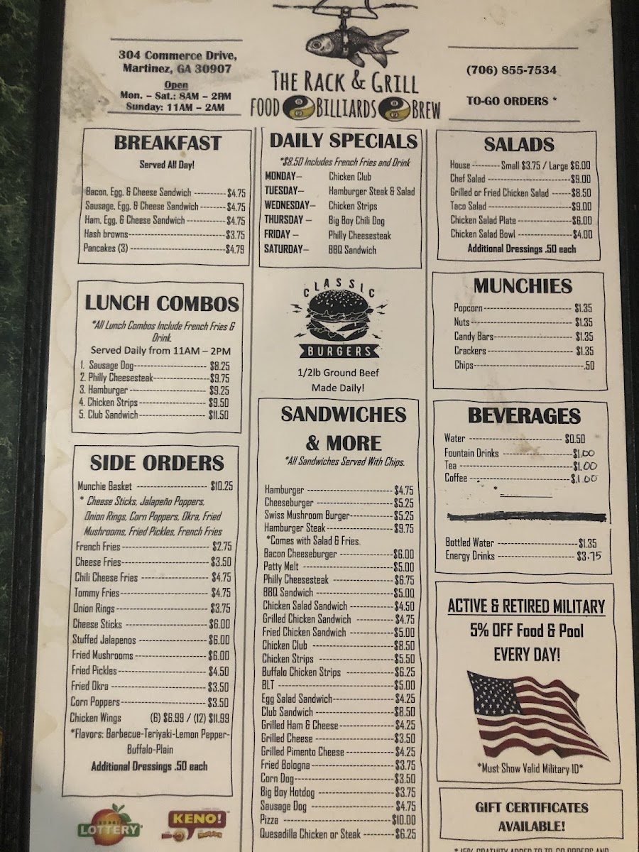 Welcome to Rack & Grill, a beloved local gem in Augusta, GA, that has been delighting patrons for over 40 years. Nestled at 304 Commerce Dr, this vibrant eatery strikes a balance between a lively atmosphere and a family-friendly vibe.